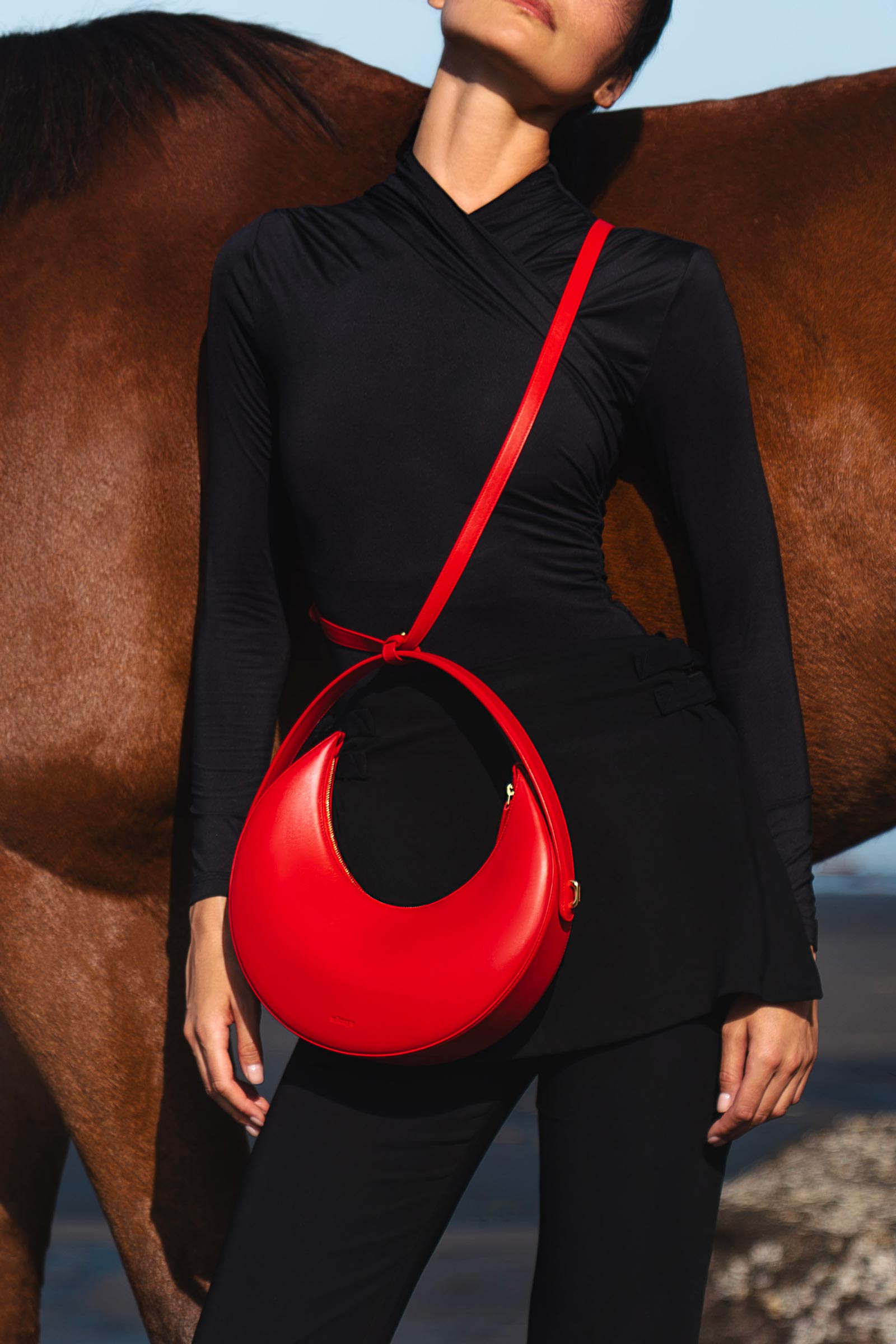 Highly convertible design offering four distinct forms in a single bag. Can be worn as a crescent-shaped clutch, sculptural circular top-handle, wrist-worn donut form, or hands-free crossbody with the shoulder strap attached. Each configuration preserves a fluid geometry and balanced silhouette.
