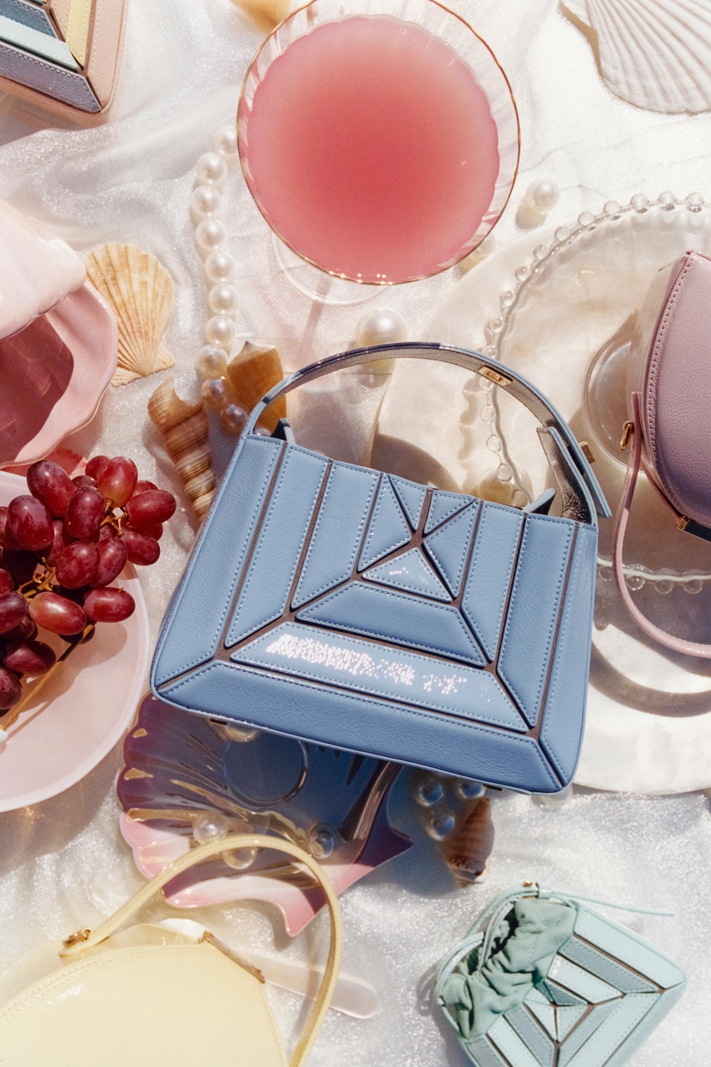 Its exterior design is a surrealist dream, reminiscent of a maze-like structure protruding outwards, with sharp, clean lines, and a 3D façade. Opening the top handles reveals a suede drawstring top edge, securing your belongings on the go.