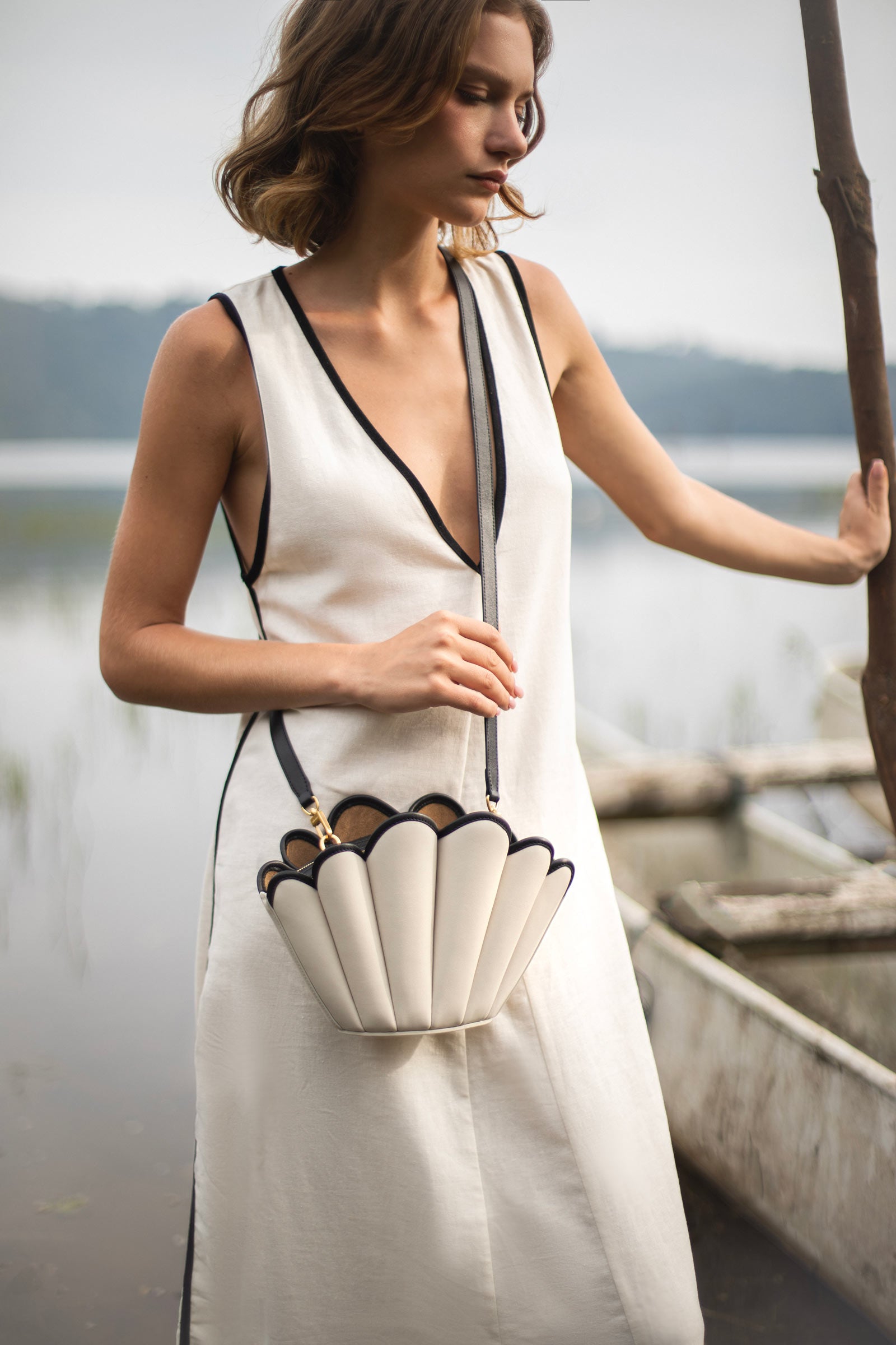 Evolved from our Seashell Tote, this compact crossbody carries the same scalloped contours in a smaller proportion. Each panel is hand-stitched to define its smooth, curved body. It features a zip closure, a suede-lined compartment inside, and detachable top handle and shoulder strap. All straps can be removed for a minimal, clutch-like use.
