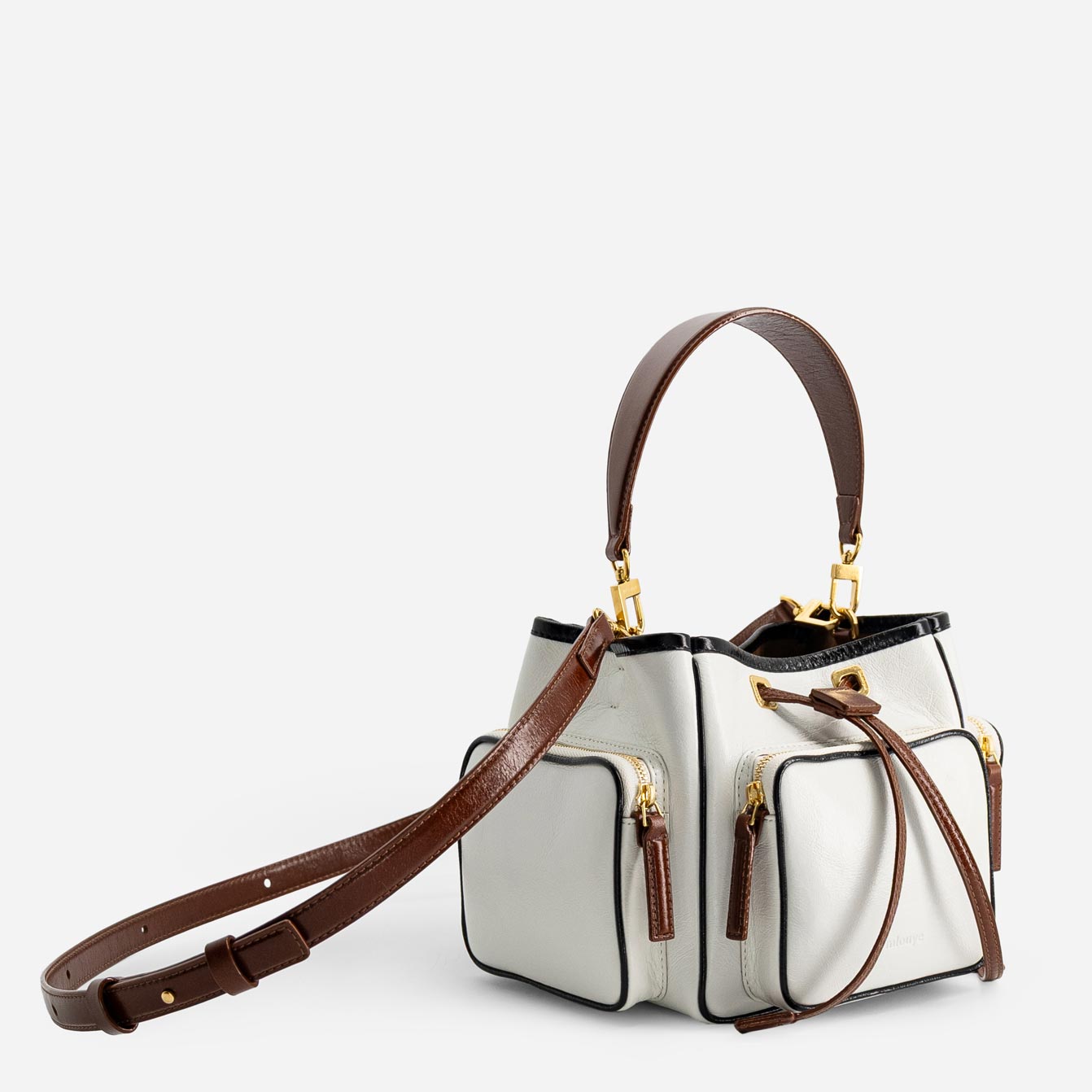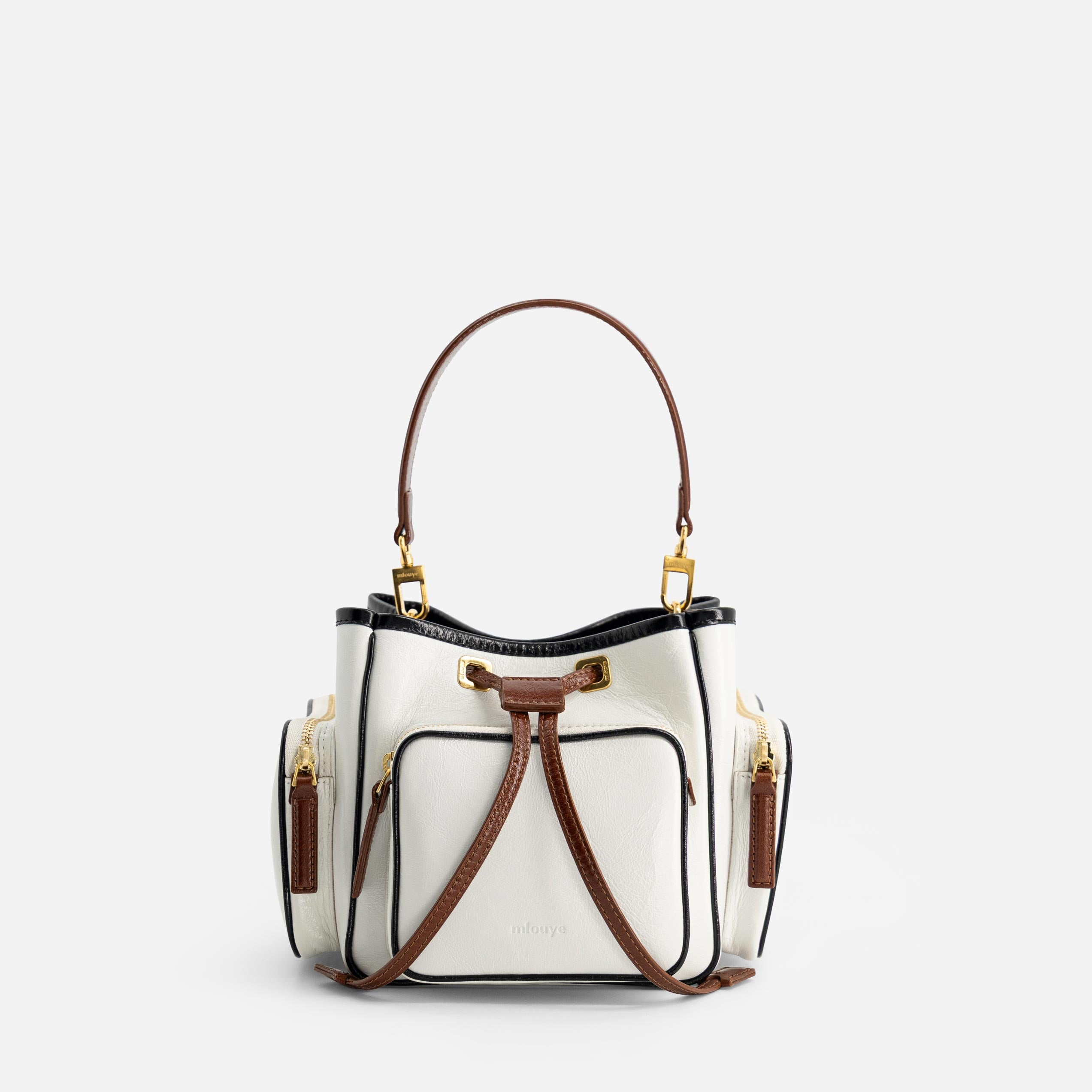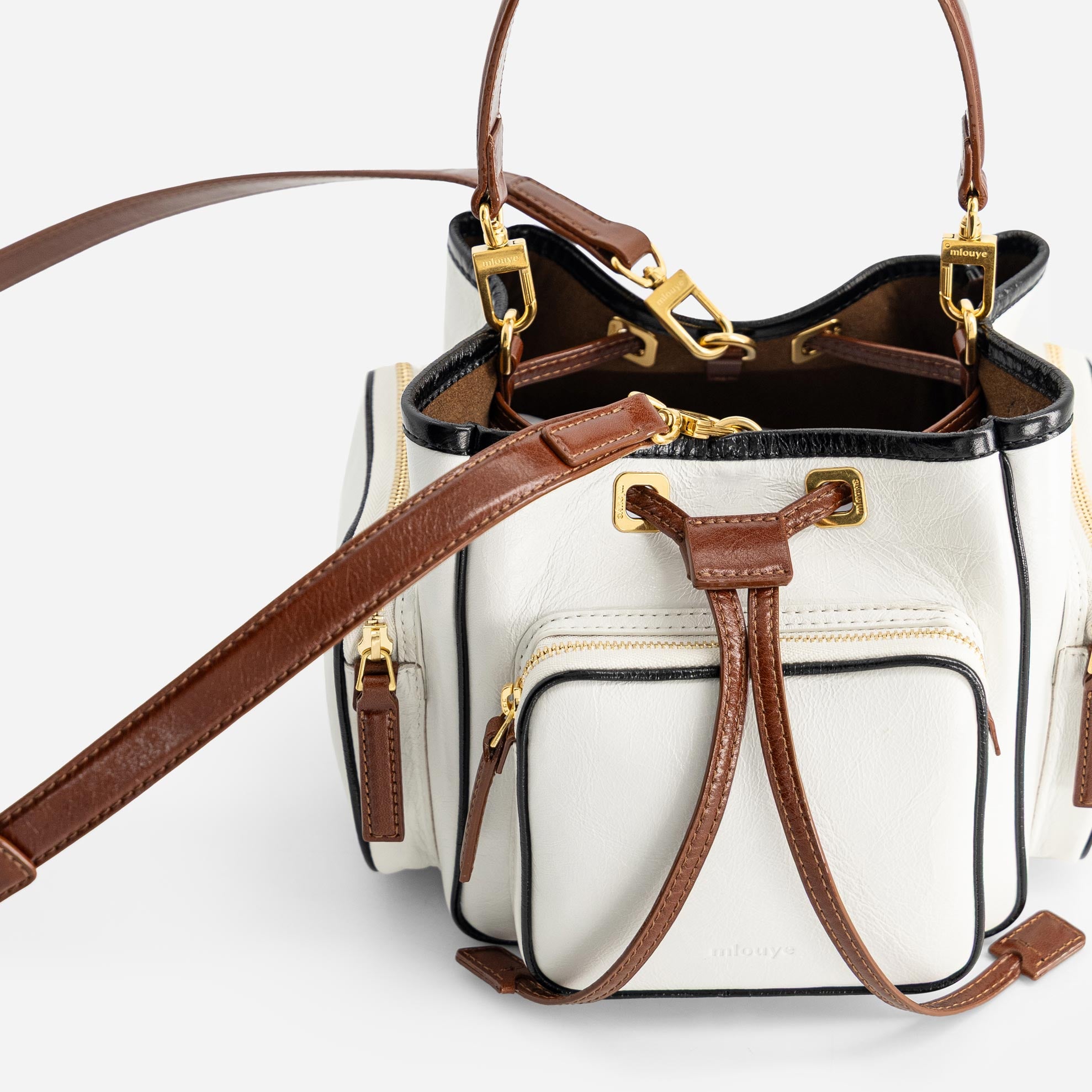 Maximalism, zero chaos - Quad is a cubic rethink of the classic bucket bag. Built on a square base and rising into a soft-edged cube, it brings structure without rigidity. Each of its four faces features a zippered pocket, keeping essentials precisely compartmentalized. The drawstring top closes with ease, while the removable strap and handle offer flexible ways to carry.