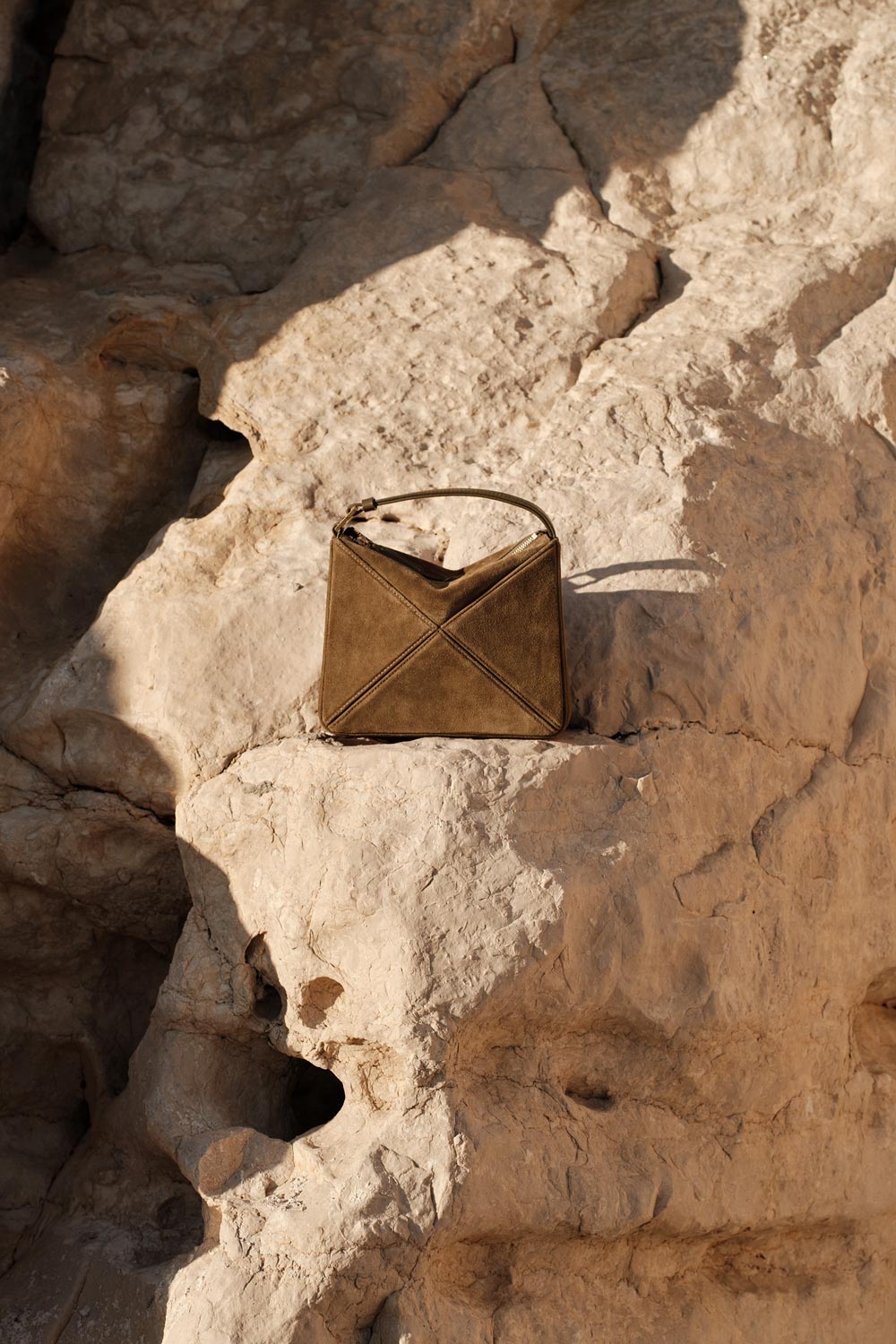 Our architectural, origami-inspired Flex Bag is now available in mini size. This compact and convertible design sits perfectly on your shoulder or in the palm of your hand. Handcrafted from Italian calf suede leather, it features a suede top with zip closure, and a detachable shoulder strap. It is roomy enough for the essentials including a large phone, mini wallet, keys and lipstick.