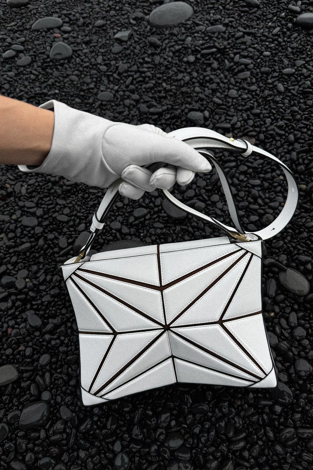 - Microsuede lining, adjustable and detachable strap, magnet closure, gold plated stainless steel hardware.