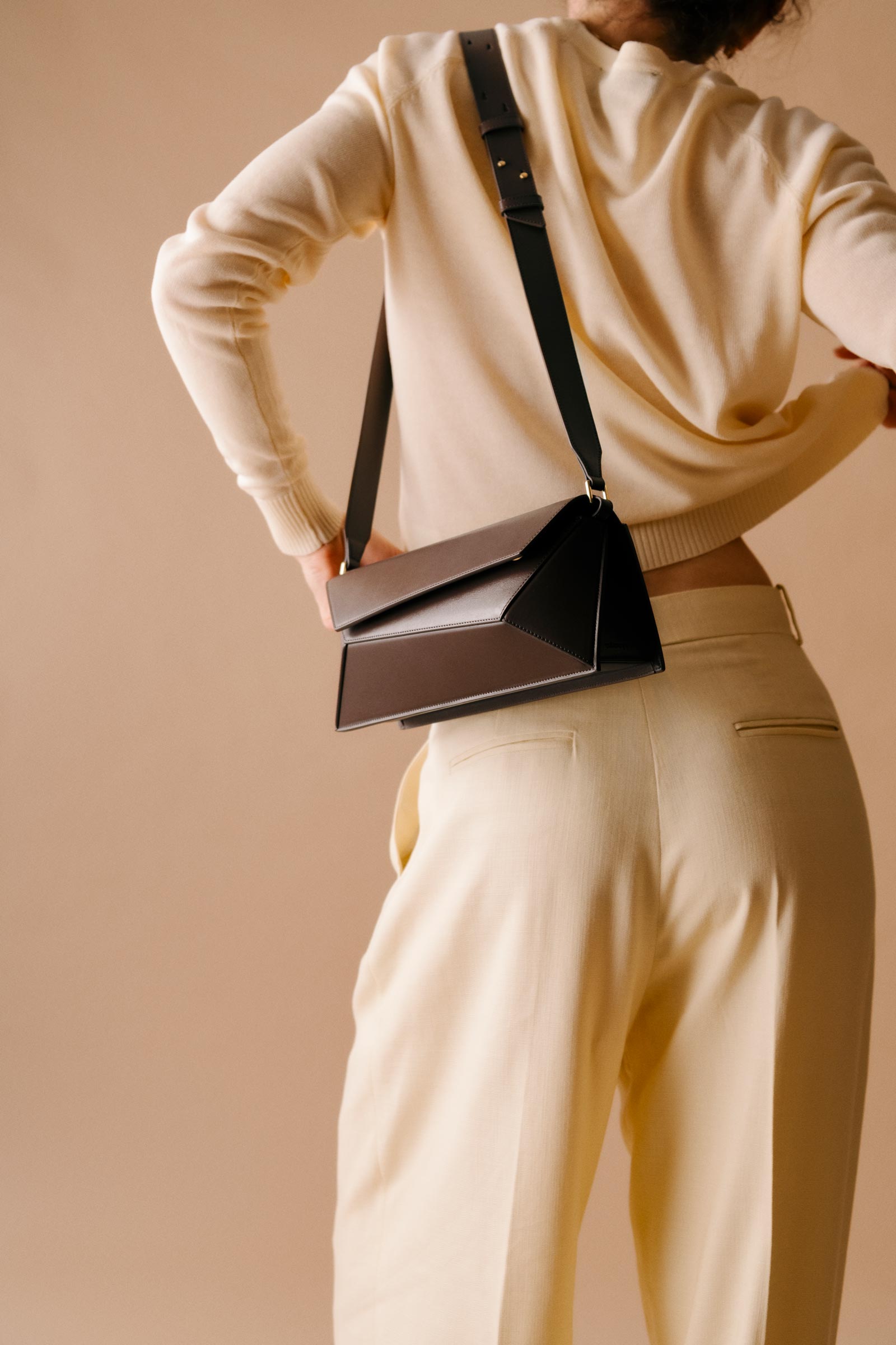 An elongated version of the original Naomi. It features the same twisted polygon details but, compared to the standard Naomi, it is wider and lower in height, creating a more elongated proportion. It can be carried by hand or worn over the shoulder.