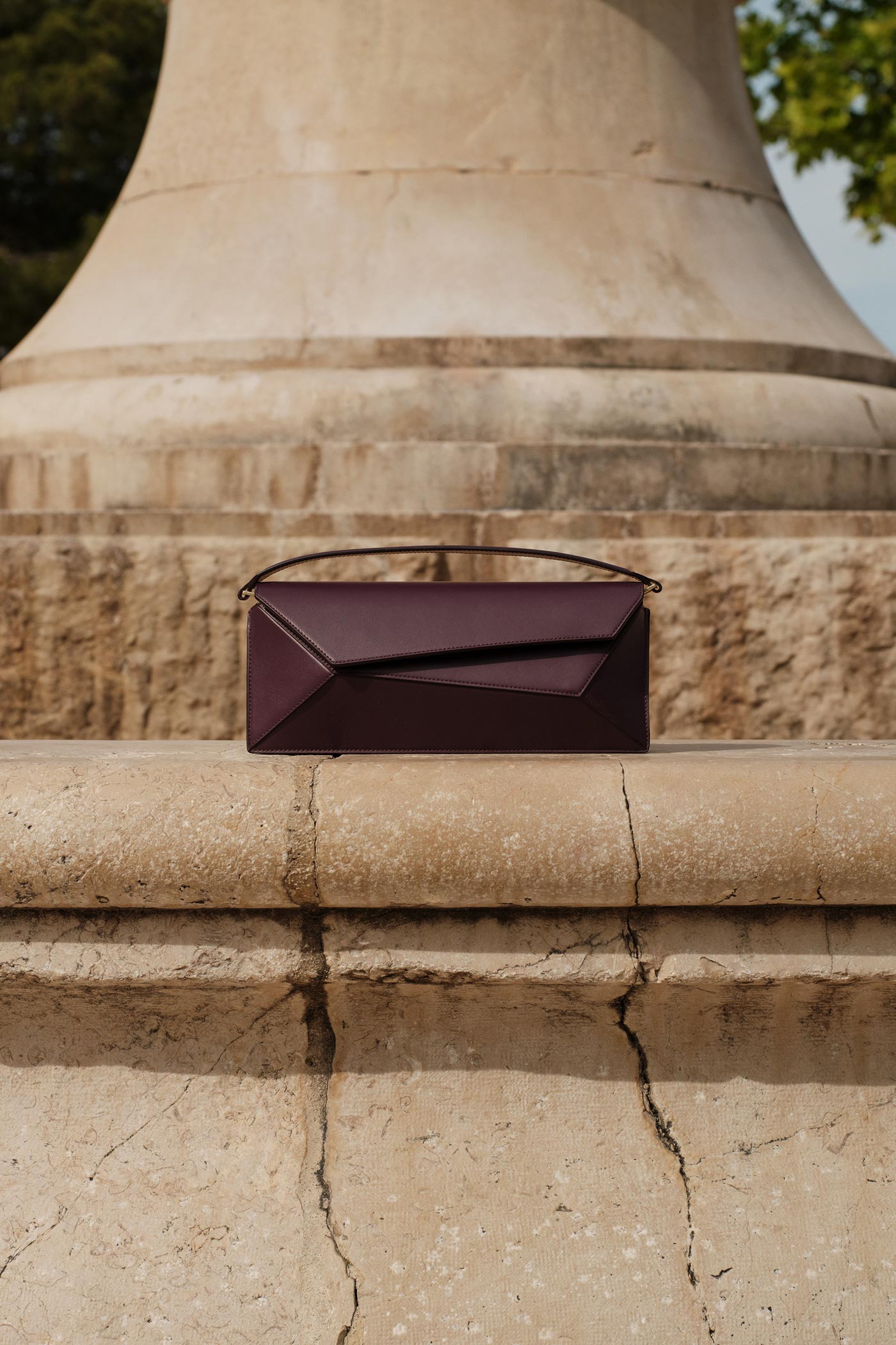 An elongated version of the original Naomi. It features the same twisted polygon details but, compared to the standard Naomi, it is wider and lower in height, creating a more elongated proportion. It can be carried by hand or worn over the shoulder.